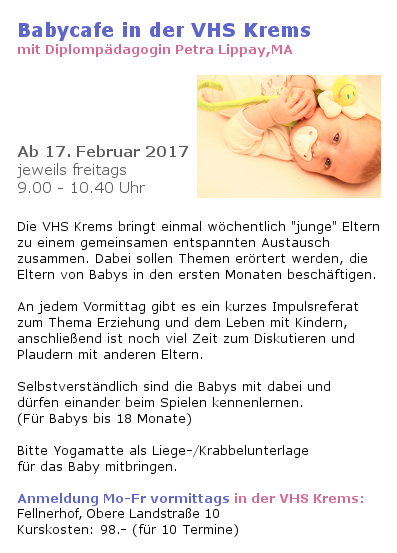 Zum ersten Mal gibt es an der VHS Krems ein wöchentliches "Babycafe" in Form eines Elternbildungkurses, bei dem die Babys mit dabei sind. Eine schöne Möglichkeit des Austausches für Eltern und Babys - bei dem das Kennenlernen & Plaudern, gemeinsames Spielen und das Thema Erziehung im Vordergrund stehen. Für Eltern mit Babys bis zum Alter von 18 Monaten.