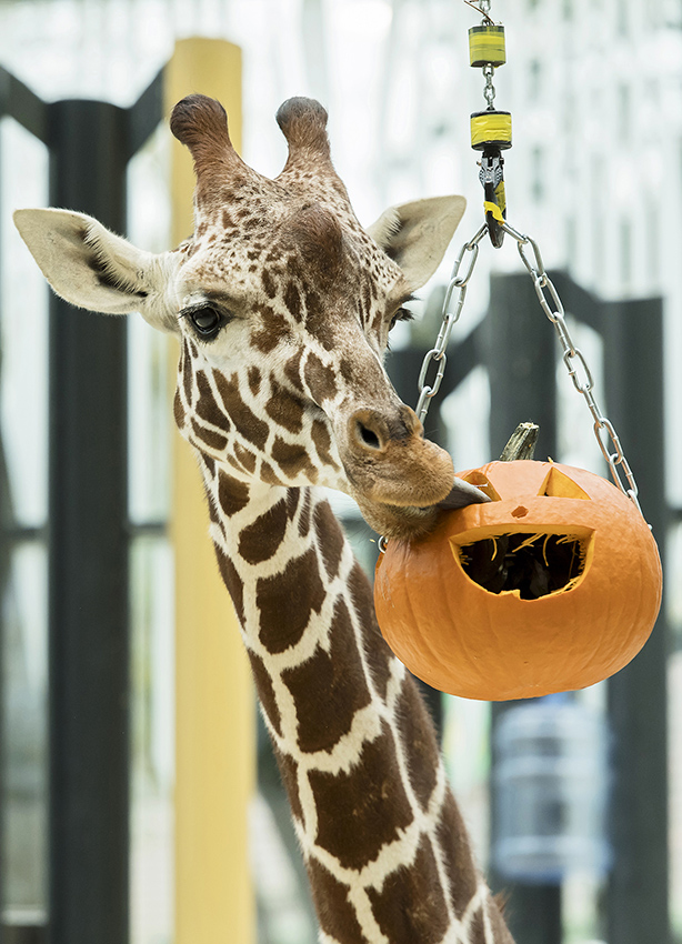 Das ist für manche Tiere eine leckere Mahlzeit, für andere eine Beschäftigung und für unsere Besucher auf jeden Fall ein Spaß zum Zuschauen", so Tiergartendirektorin Dagmar Schratter. Erstmals mitfeiern und mitnaschen dürfen die beiden Netzgiraffen Fleur und Sofie. Gefüllt mit Pellets und Weidenblättern und giraffengerecht auf deren Kopfhöhe aufgehängt, weckt der Kürbis schnell ihr Interesse. Mit ihren langen Zungen fischen die beiden Giraffen die Leckereien geschickt aus den Öffnungen.