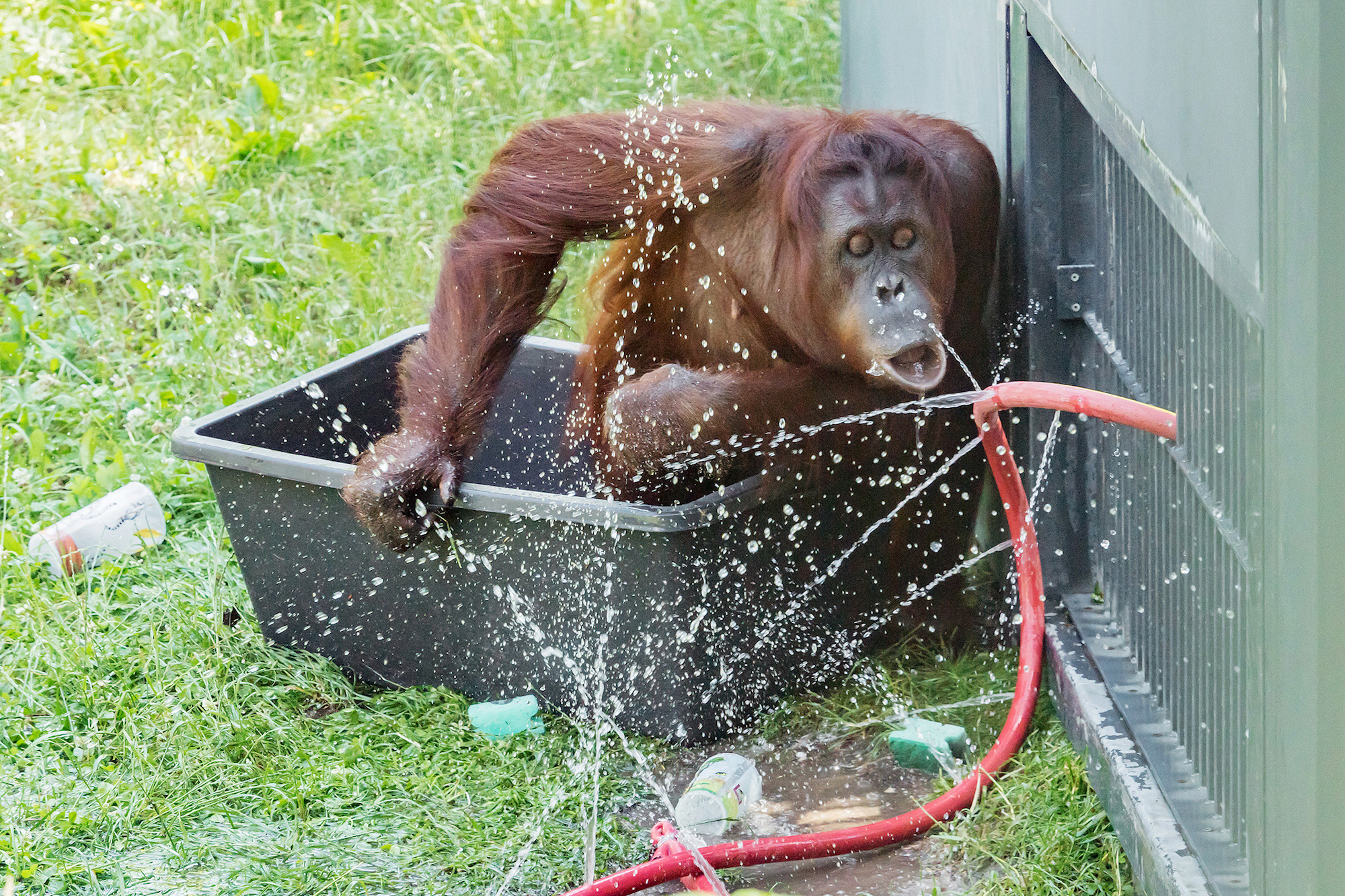 Die Pfleger überlegen sich immer wieder Neues, um das Pritscheln spannend zu machen: von Bechern bis zu Badeenten. Die drei Tiere schätzen das Wasser auf unterschiedliche Art und Weise. Tierpfleger Fredi Maier: „Sol füllt gerne Becher mit Wasser an, trinkt zur Abkühlung ein paar Schlucke oder lässt sich das Wasser direkt aus dem Schlauch in den Mund laufen.“ Die fast 55 Jahre alte Mota geht es gemütlicher an. Sie lässt Schwämme vollsaugen, um sich dann mit ihnen in den Schatten zurückzuziehen und zu spielen. Am liebsten noch mit einem Tuch zugedeckt – als Sonnenschutz. Von Orang-Utans kann man einiges lernen. Das Männchen Vladimir beweist gerne seine Kraft. „Er wirft die Tonne so oft um, bis er von oben bis unten nass ist. Und wir gleich mit, wenn er besonders wild ist“, schmunzelt Maier.