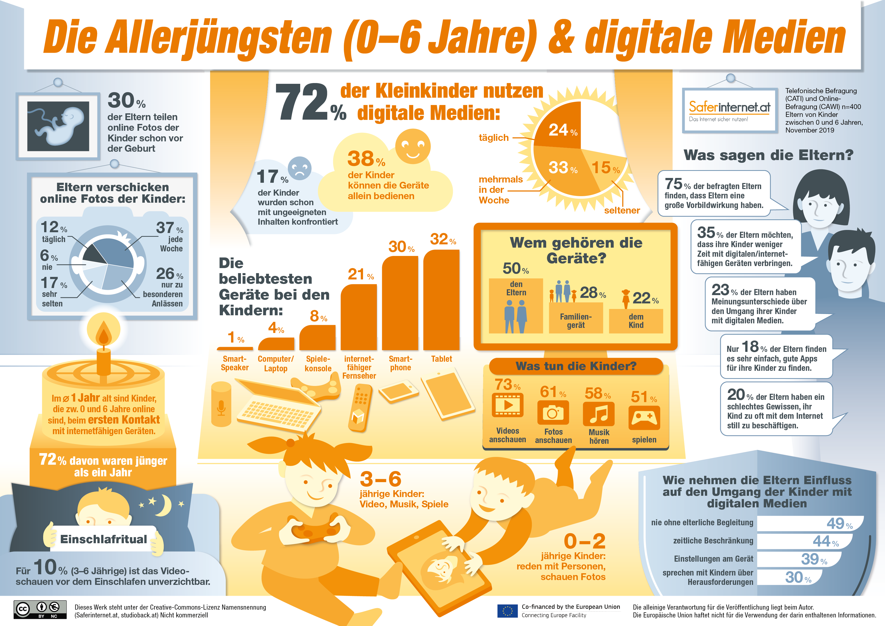 Die Studie „Die Allerjüngsten und digitale Medien“ wurde vom Institut für empirische Sozialforschung (IFES) im Auftrag des Österreichischen Instituts für angewandte Telekommunikation (ÖIAT) und der ISPA – Internet Service Providers Austria im Rahmen der Initiative Saferinternet.at durchgeführt. Befragt wurden 400 Eltern von Kindern zwischen 0 und 6 Jahren. Vergleichsdaten für die Altersgruppe der 3- bis 6-Jährigen liegen aus einer Saferinternet.at-Befragung aus dem Jahr 2013 vor. Ergänzt wurde die Studie mit Praxiserfahrungen aus Saferinternet.at-Workshops.