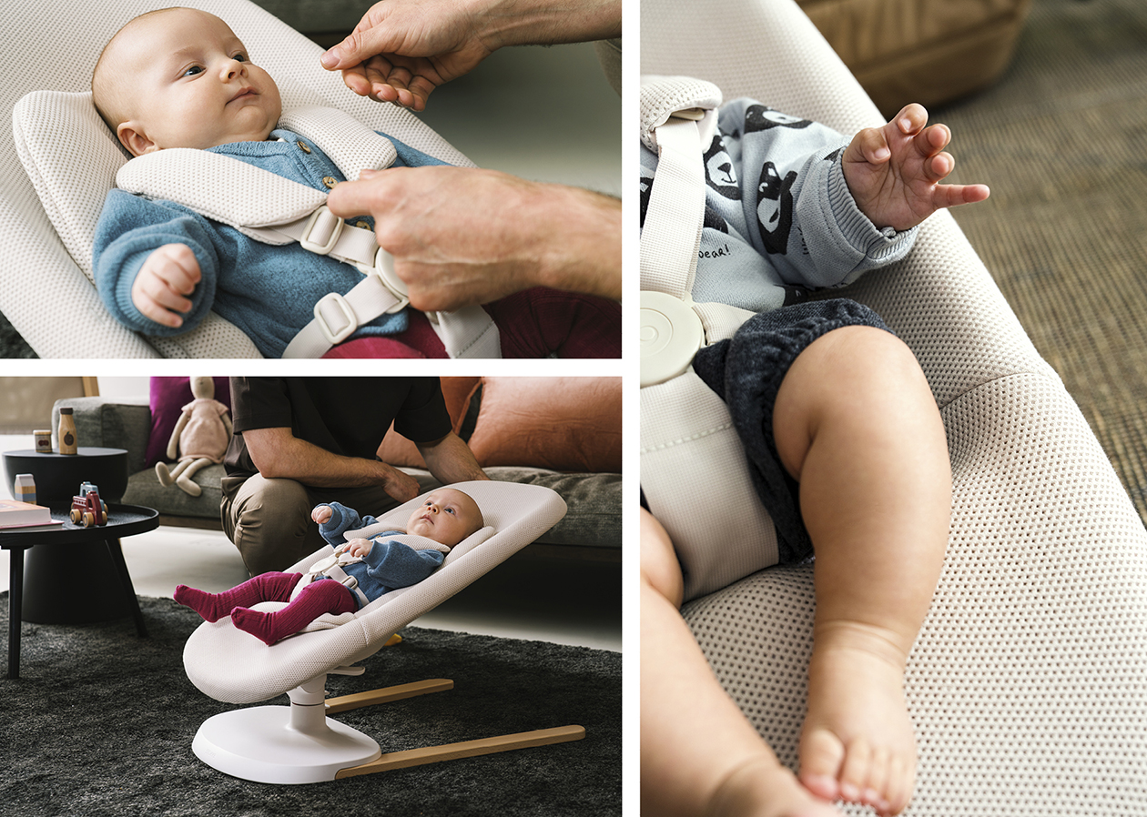 Die Wippe verfügt über drei Einstellungen mit unterschiedlichen Neigungswinkeln für verschiedene Entwicklungsstufen. Ein herausnehmbares Kissen bietet zusätzlichen Support und eine sichere Umgebung für Neugeborene. So entstand ein durchdachtes Design, das für Babys vom kleinsten Neugeborenen bis zu einem Gewicht von 11 kg ausgelegt ist.